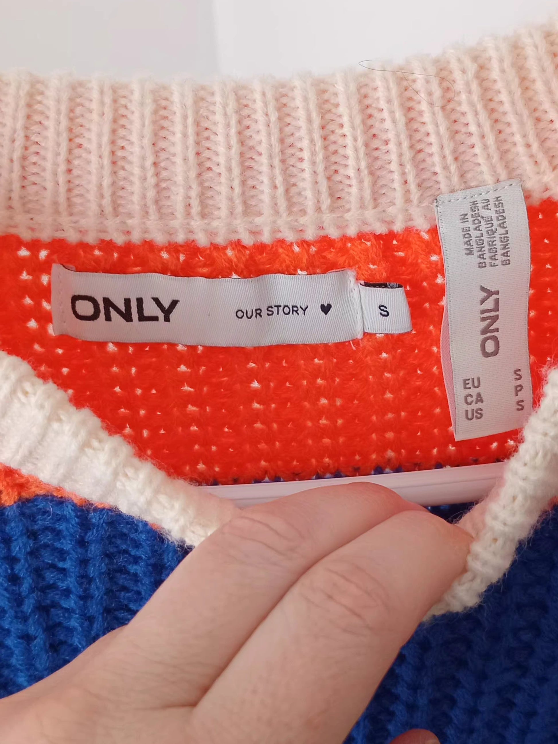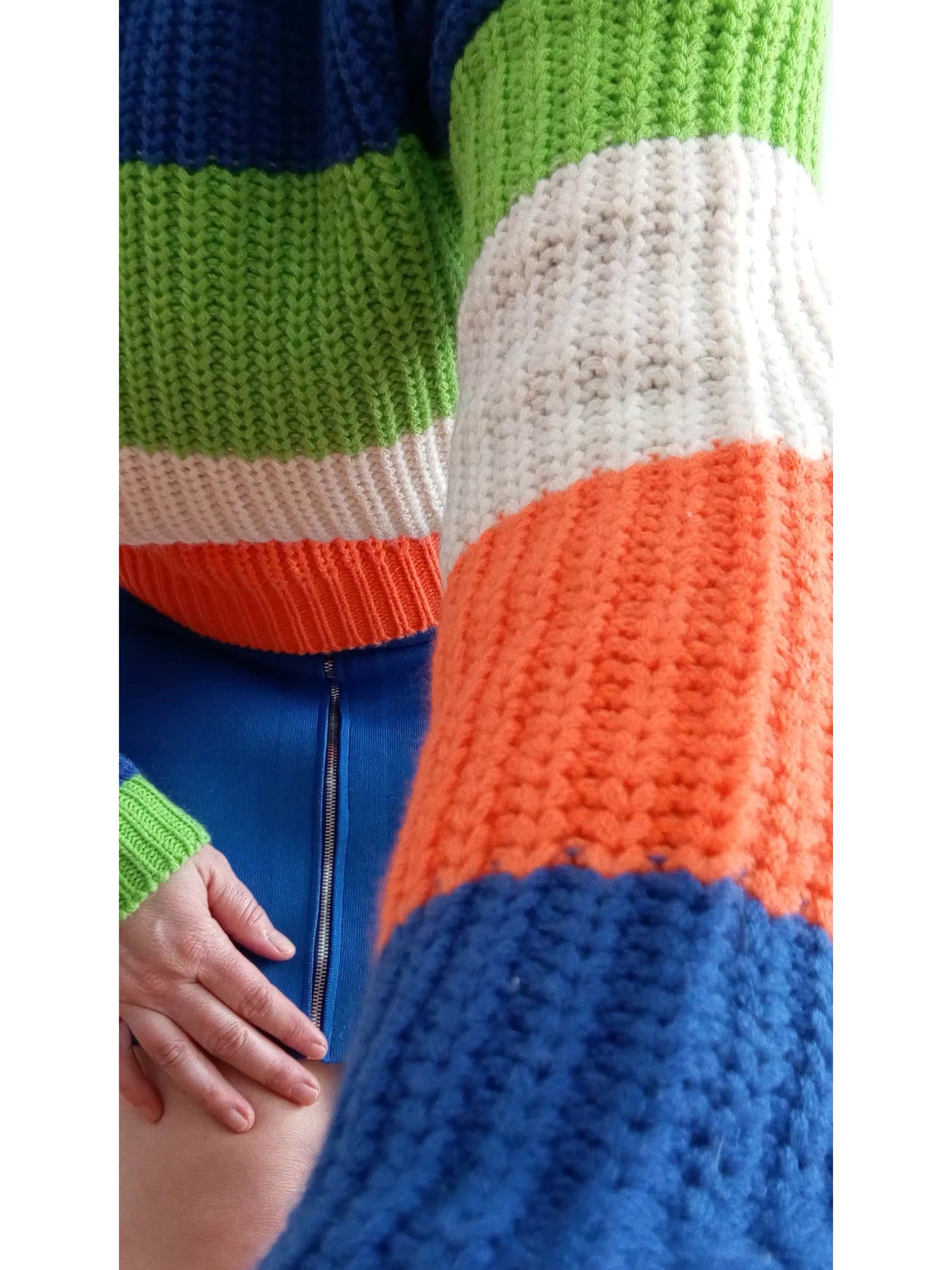 Je l’ai choisi parce qu’il est impossible à ignorer. Les couleurs sont magnifiques : un orange vif, un bleu royal, un vert lime et un crème. L’ensemble est à la fois éclaté et harmonieux. C’est un vrai chandail qui met de bonne humeur.
